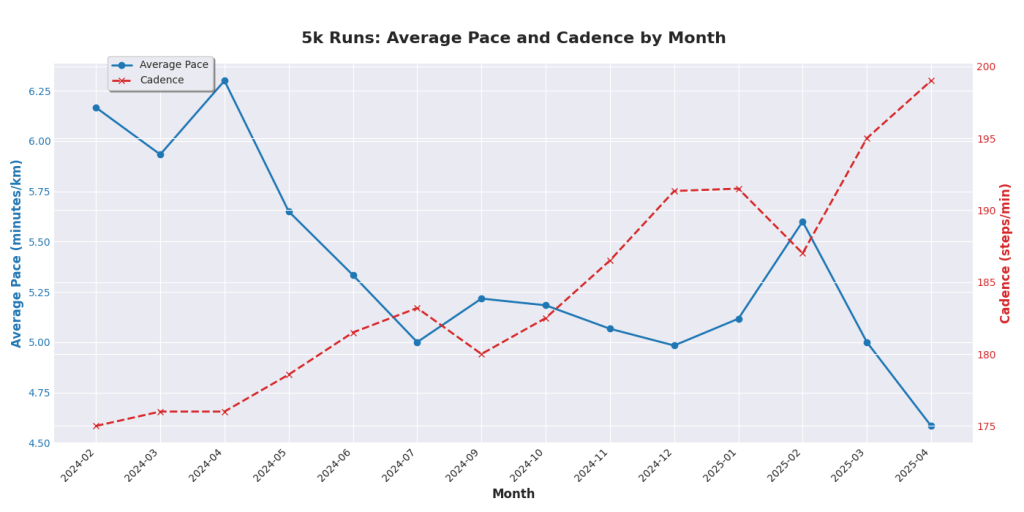 Similarly, my 5k runs show a nice progression, with pace improving by roughly 1.58 minutes/km, from about 6.17 min/km in February 2024 to 4.58 min/km in April 2025, alongside a cadence increase of approximately 24.0 steps/min, nearing 199.0 steps/min.