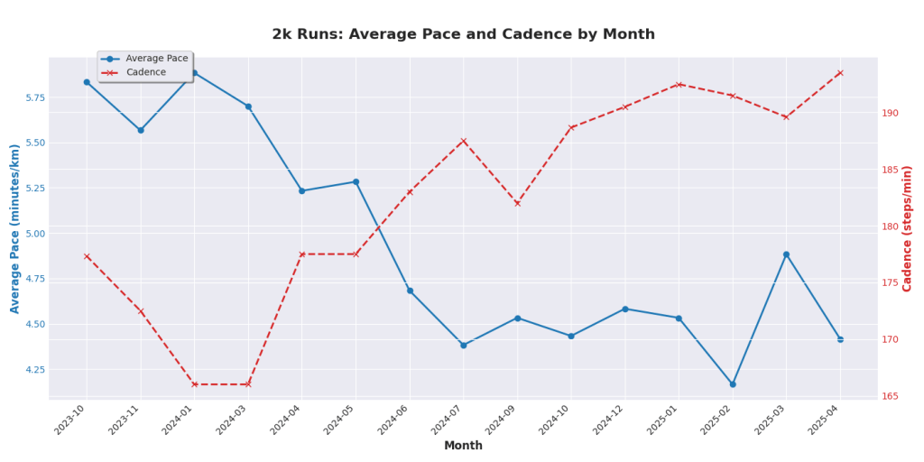 For 2k runs, my average pace has seen a notable improvement of approximately 1.42 minutes/km, dropping from around 5.83 min/km in October 2023 to 4.42 min/km by April 2025.
